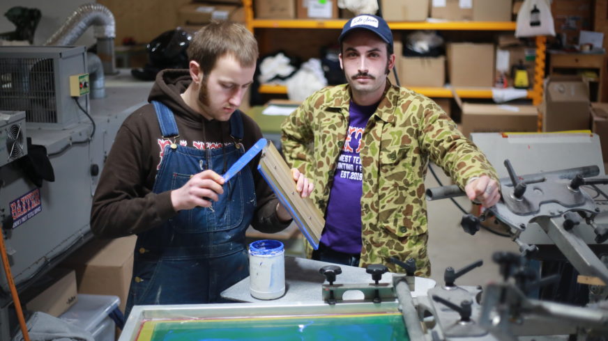 On peut parler de « match » parfait. Un patron, un apprenti, des passions partagées et la rencontre au bon moment. Paul-Loup Baxter Duchatel, jeune patron de l’Atelier Baxter Sérigraphie et son apprenti Tom Morattel, 22 ans, apprenti sérigraphe en 4ème année, évoluent ensemble entre les presses et les encres, produisant à petite échelle des produits sérigraphiés.